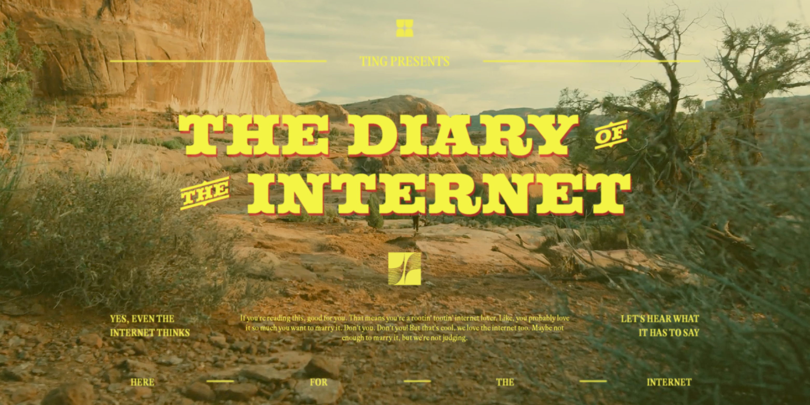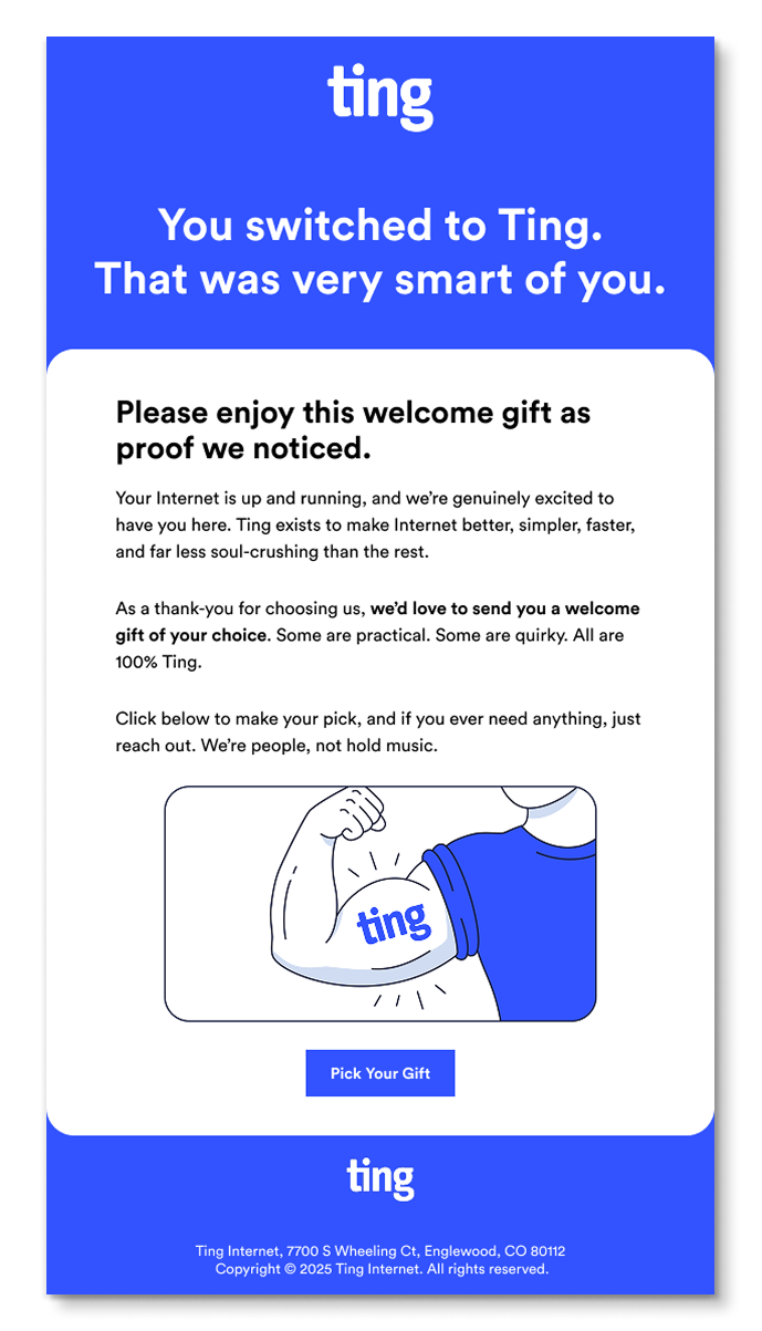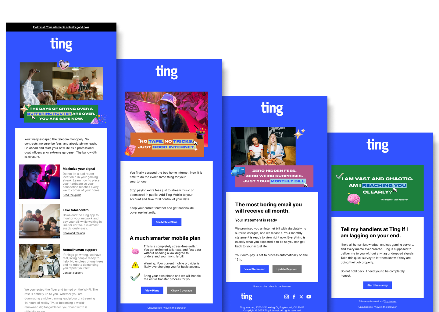 This multi-channel campaign captures Ting's challenger brand identity through a modular design system and dramatic video commercials. From adaptable email templates to bold on-screen typography and end card designs for the "Here for the Internet" spots, the visual language disrupts traditional internet provider marketing with an unapologetic, playful tone.