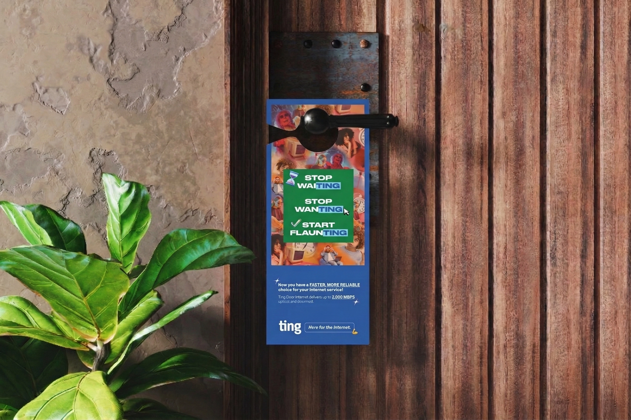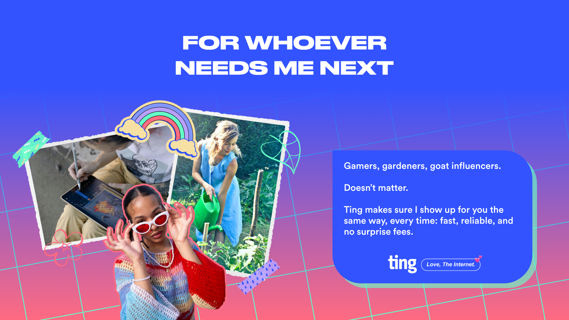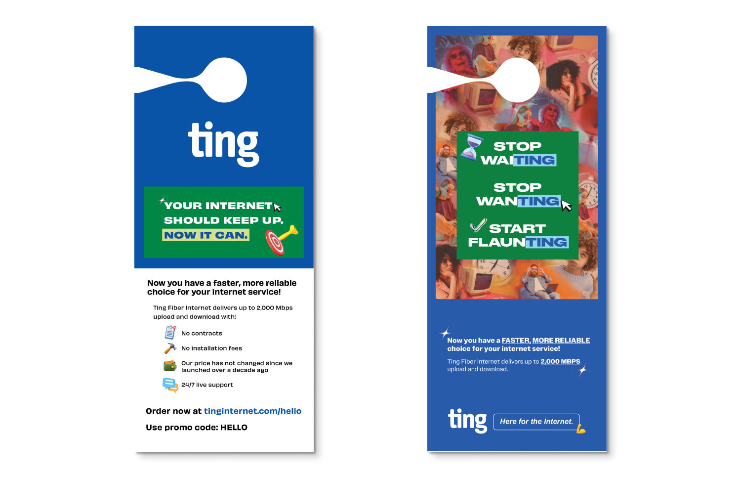 This multi-channel campaign captures Ting's challenger brand identity through a modular design system and dramatic video commercials. From adaptable email templates to bold on-screen typography and end card designs for the "Here for the Internet" spots, the visual language disrupts traditional internet provider marketing with an unapologetic, playful tone.